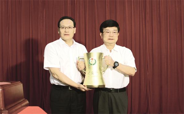 州委书记杨斌,州委副书记、代理州长迟中华喜接“长安杯”奖杯。